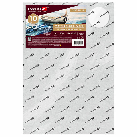 Бумага для акварели ХЛОПОК 100%, 300 г, 270x390 мм, среднее зерно, 10 листов, BRAUBERG ART PREMIERE, 115336