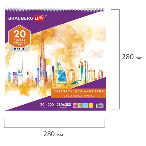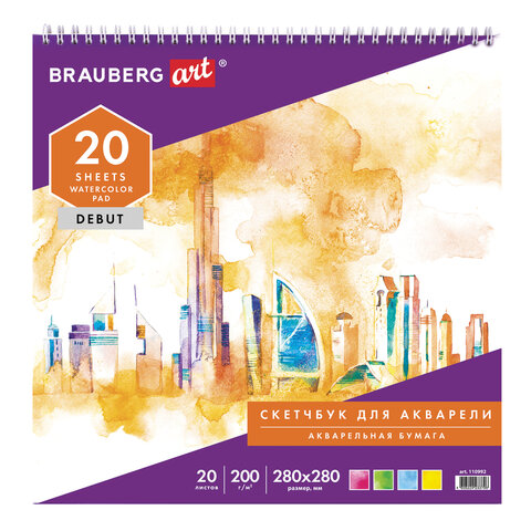 Скетчбук, акварельная белая бумага 200 г/м2 ГОЗНАК, 280х280 мм, 20 л., гребень, подложка, BRAUBERG ART DEBUT, 110992