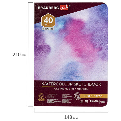 Скетчбук для акварели, 200 г/м2, 148х210 мм, среднее зерно, 40 л., книжный переплет, BRAUBERG ART PREMIERE, 113262