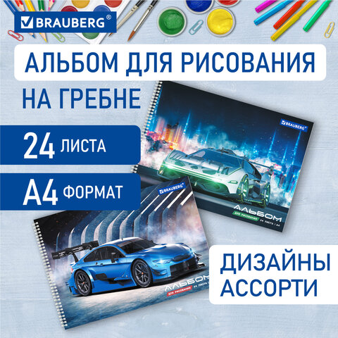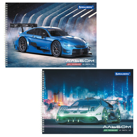 Альбом для рисования А4, 24 листа, гребень, обложка картон, BRAUBERG, 195х285 мм, "Спорткар" (2 вида), 106695