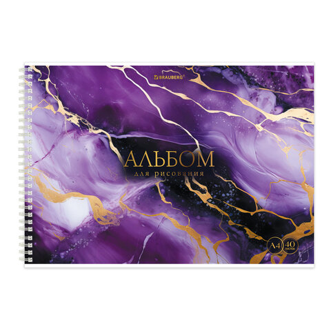 Альбом для рисования А4, 40 л., гребень, обложка картон, BRAUBERG, 195х285 мм, "МРАМОР" (4 вида), 107121