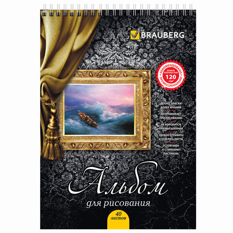 Альбом для рисования, А4, 40 листов, гребень, выборочный лак, подложка, 120 г/м2, BRAUBERG, 205х290 мм, "Картина" (2 вида), 102834
