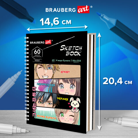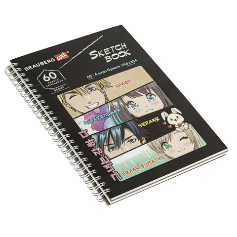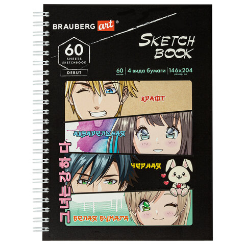 Скетчбук, 4 типа бумаги (акварельная, белая, черная, крафт) 146х204 мм, 60 л., гребень, BRAUBERG ART DEBUT, АНИМЕ, 115066
