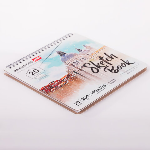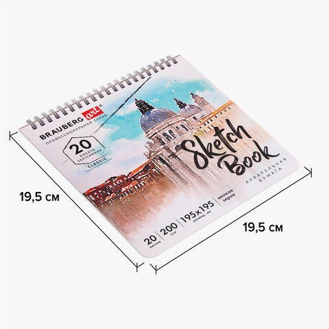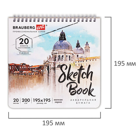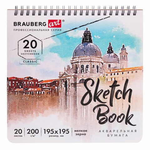 Скетчбук, акварельная бумага 200 г/м2, 195х195 мм, 20 л., гребень, твердая обложка, BRAUBERG ART, 112979