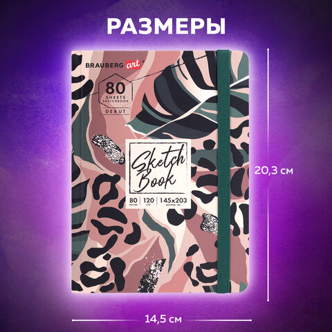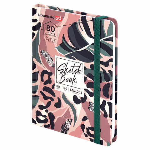 Скетчбук, белая бумага 120 г/м2, 145х203 мм, 80 л., резинка, твердый, BRAUBERG ART DEBUT "Листья", 114587