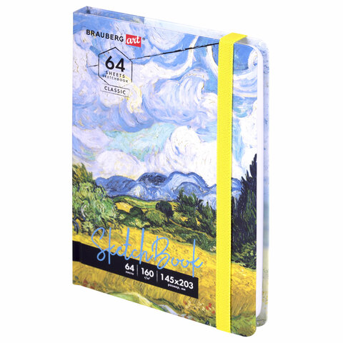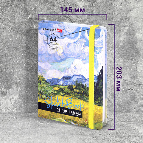 Скетчбук, белая бумага 160 г/м2, 145х203 мм, 64 л., резинка, твердый, BRAUBERG ART CLASSIC "Ван Гог", 114590