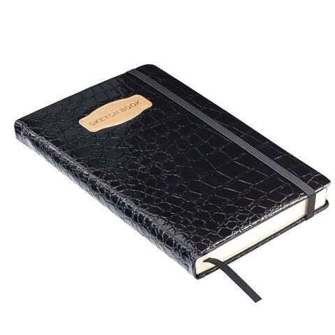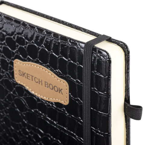 Скетчбук, слоновая кость 140 г/м2, 130х210 мм, 80 л., КОЖЗАМ, резинка, BRAUBERG ART CLASSIC, CROCO, черный, 116470