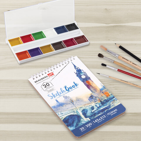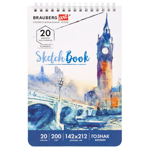 Скетчбук, ватман ГОЗНАК 200 г/м2, 142х212 мм, 20 л., гребень, твердая обложка, BRAUBERG ART CLASSIC, 112977