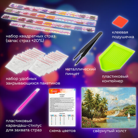 Картины стразами ОСТРОВ СОКРОВИЩ - это наборы для создания картин в технике алмазной мозаики. Холст с нанесенным изображением и клеевым слоем заполняется акриловыми стразами. В наборе содержится всё необходимое для создания шедевра своими руками.