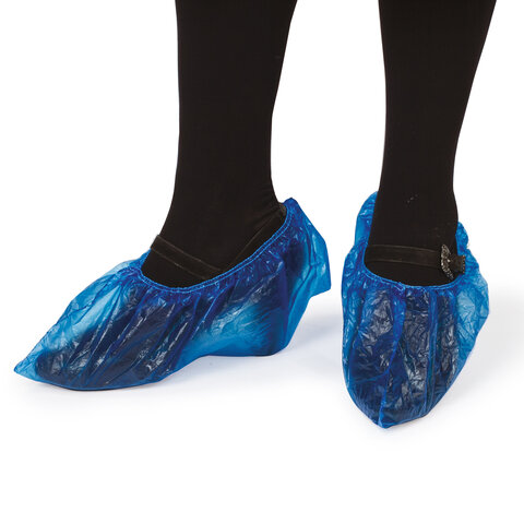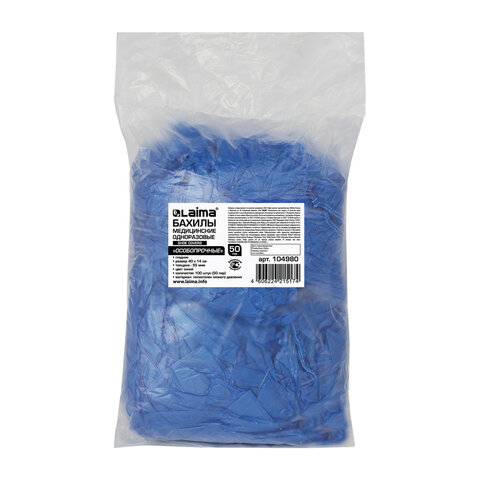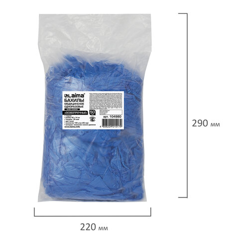 Бахилы КОМПЛЕКТ 100 штук (50 пар), ОСОБО ПРОЧНЫЕ, размер 40х15 см, 55 мкм, 6 г, ПНД, LAIMA, 104980