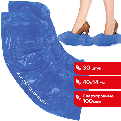 Бахилы КОМПЛЕКТ 30 штук (15 пар), СВЕРХПРОЧНЫЕ, двойная резинка, 40х14 см, 100 мкм, 10 г, LAIMA, 104981