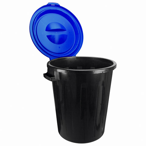 90-ти литровый пластиковый контейнер / бак для мусора с крышкой. Крышка крепится к баку на специальных петлях-защелках, что позволяет ей перекидываться и держаться на петлях. Крышка оснащена защелкой. Удобные ручки для переноски.