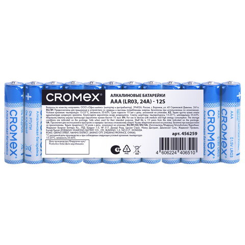 Батарейки алкалиновые "мизинчиковые" КОМПЛЕКТ 12 шт., CROMEX (КРОМЕКС) Alkaline, AAA (LR03, 24A), спайка, 456259