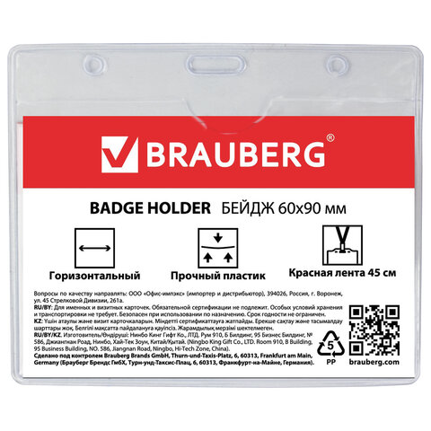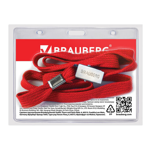 Бейдж горизонтальный (60х90 мм), на красной ленте 45 см, BRAUBERG, 231155