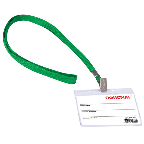 Бейдж горизонтальный (60х90 мм), на зеленой ленте 45 см, ОФИСМАГ, 235705