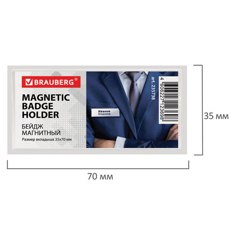 Бейдж магнитный 35х70 мм, BRAUBERG MAGNETIC, 235738
