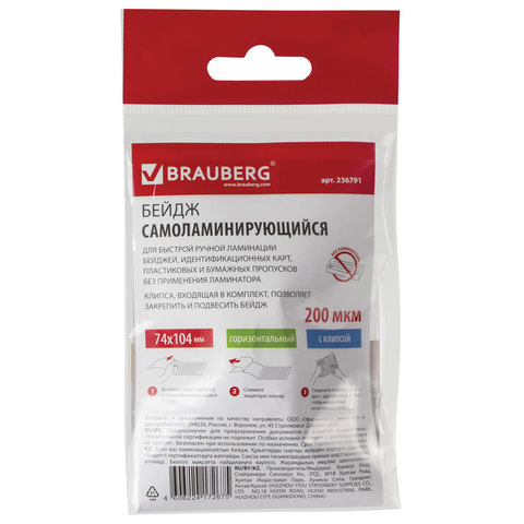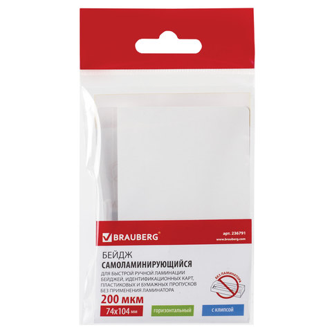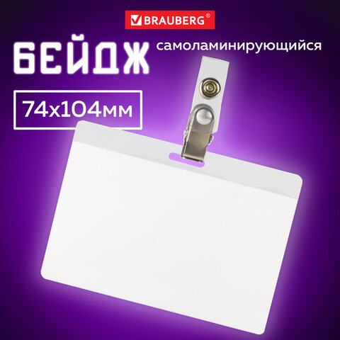 Бейдж самоламинирующийся горизонтальный (74х104 мм), с клипсой, BRAUBERG, 236791
