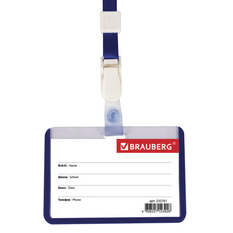 Бейдж школьника горизонтальный (55х90 мм), на ленте со съемным клипом, СИНИЙ, BRAUBERG, 235761