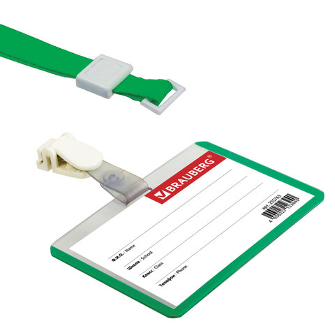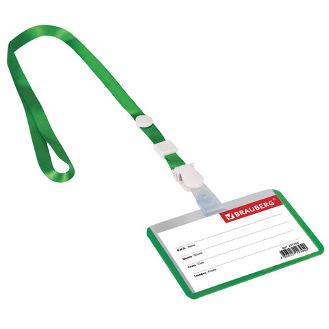 Бейдж школьника горизонтальный (55х90 мм), на ленте со съемным клипом, ЗЕЛЕНЫЙ, BRAUBERG, 235763