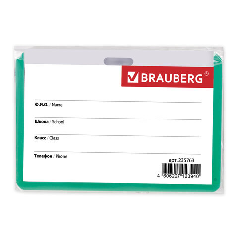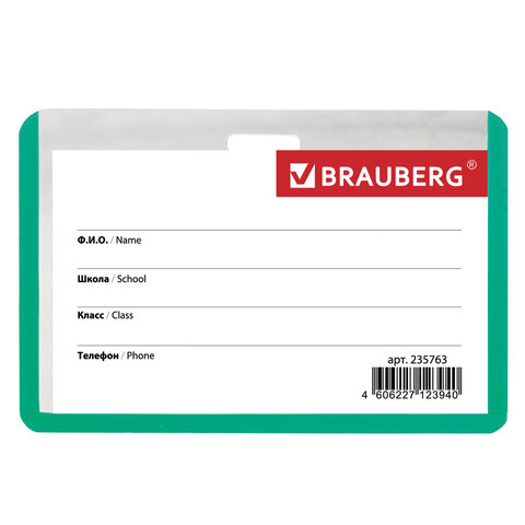 Горизонтальный бейдж школьника BRAUBERG с зеленой окантовкой используется для идентификации учащегося в образовательных учреждениях.
