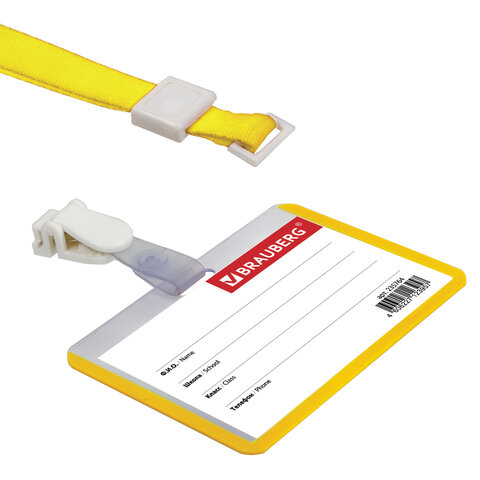 Бейдж школьника горизонтальный (55х90 мм), на ленте со съемным клипом, ЖЕЛТЫЙ, BRAUBERG, 235764