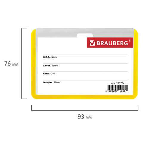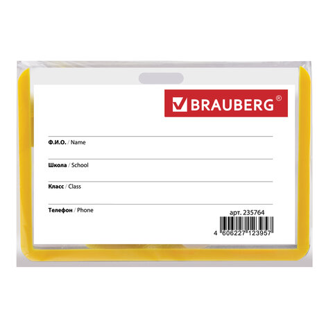 Горизонтальный бейдж школьника BRAUBERG с желтой окантовкой используется для идентификации учащегося в образовательных учреждениях.