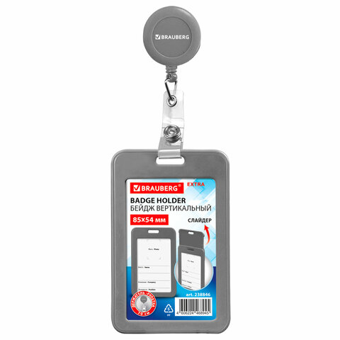 Вертикальный бейдж с рулеткой BRAUBERG для хранения тонких пропусков, карточек, ID-карт, проездных и банковских карт.