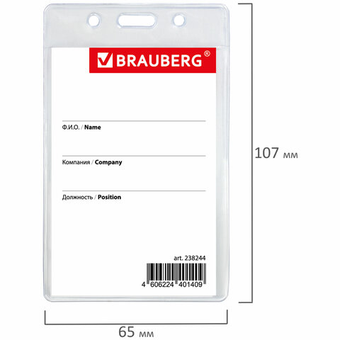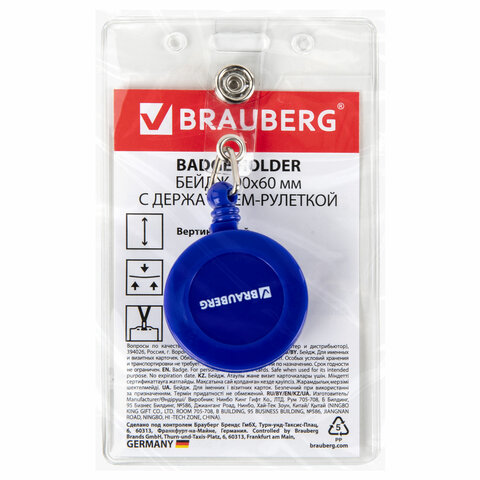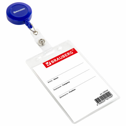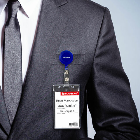 Вертикальный бейдж BRAUBERG на держателе-рулетке используется для размещения именных карточек, пропусков, пластиковых карт.