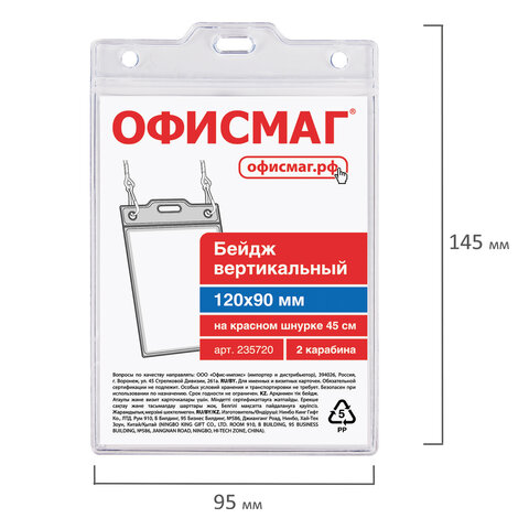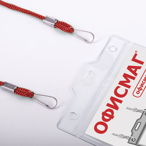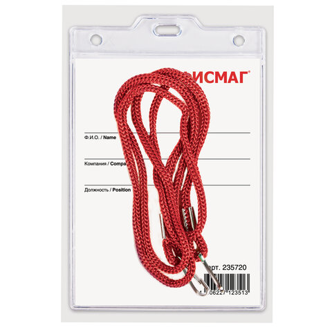 Бейдж вертикальный БОЛЬШОЙ (120х90 мм), на красном шнурке 45 см, 2 карабина, ОФИСМАГ, 235720