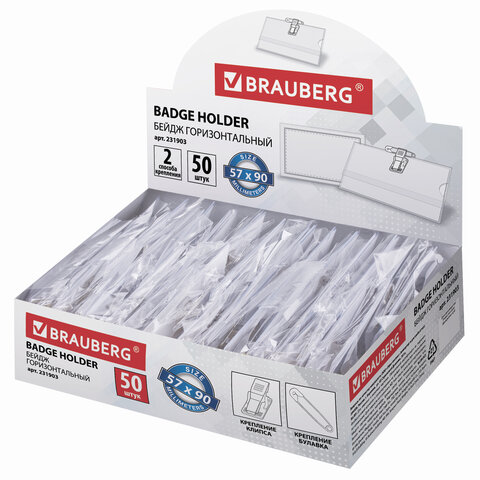 Бейдж горизонтальный (57х90 мм), КОМПЛЕКТ 50 шт., с клипсой и булавкой, жесткий, BRAUBERG, 231903