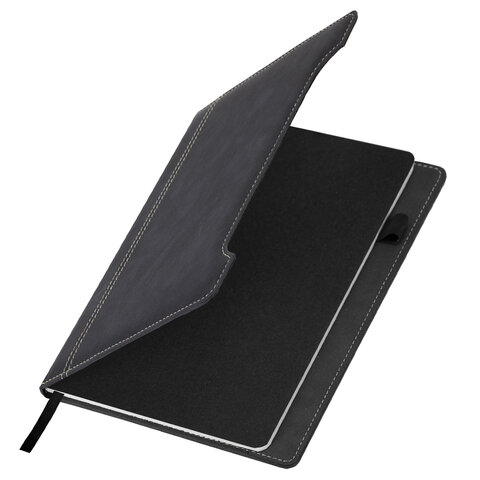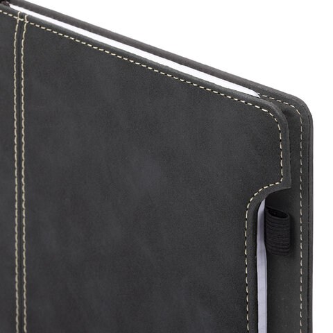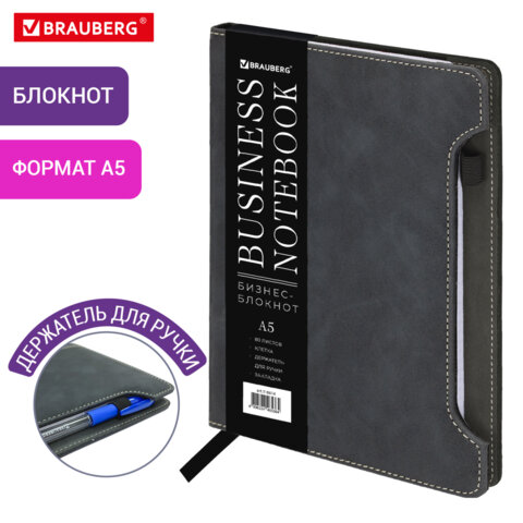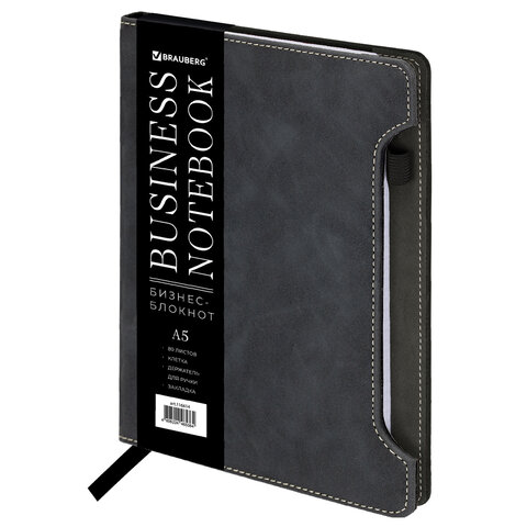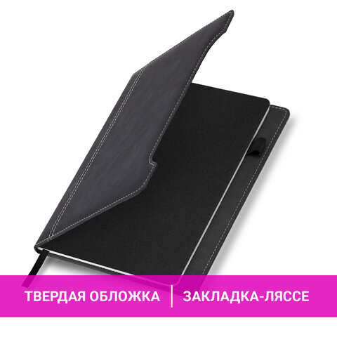 Блокнот А5 165x218 мм, BRAUBERG "Perfect", под кожу софт-тач, держатель для ручки, 80 листов, клетка, черный, 116614