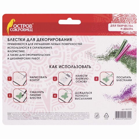 Блестки для декорирования ОСТРОВ СОКРОВИЩ используются для декорирования различных поделок и аппликаций, в украшении предметов интерьера, изготовлении поздравительных открыток и других изделий в различных техниках рукоделия.