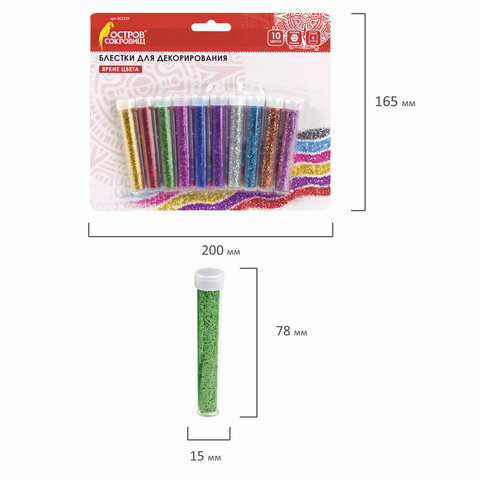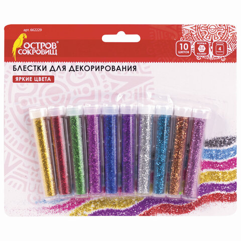 Блестки (глиттер) для декора, поделок, DIY, творчества, оформления, ОСТРОВ СОКРОВИЩ, НАБОР 10 цветов по 4 грамма, блистер, 662229