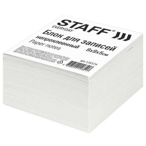 Блок для записей непроклеенный, 9х9х5 см, плотность 55 г/м2, белизна 70-80%, STAFF, 126574