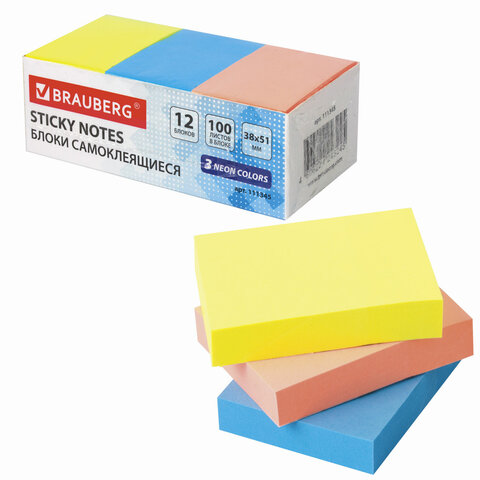 Блоки самоклеящиеся (стикеры) BRAUBERG 38х51 мм, 100 листов, НАБОР 12 штук, 3 неоновых цвета, 111345