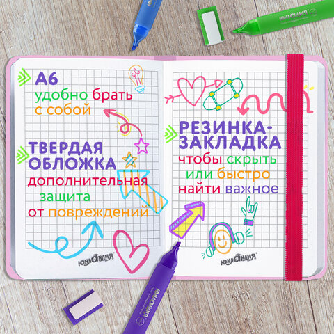 Яркий блокнот ЮНЛАНДИЯ для записей и заметок с практичной твердой обложкой с матовой ламинацией. Резинка-фиксатор надёжно защищает листы от замятия.