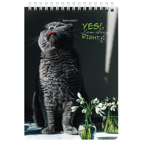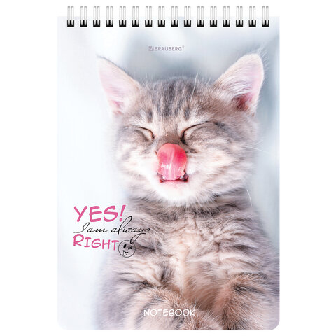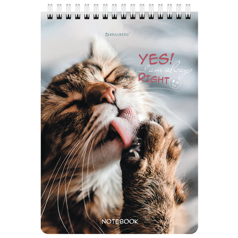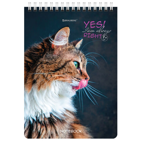 Блокнот А5 (146х206 мм), 80 л., гребень, картон, клетка, BRAUBERG, "Довольные коты", 114374