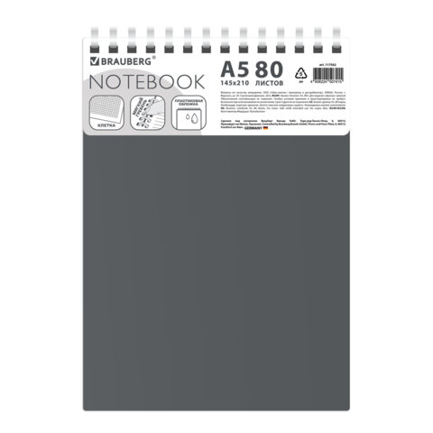 Блокнот А5, 80 л., силиконовый гребень, обложка пластик, клетка, BRAUBERG, серый, 117562