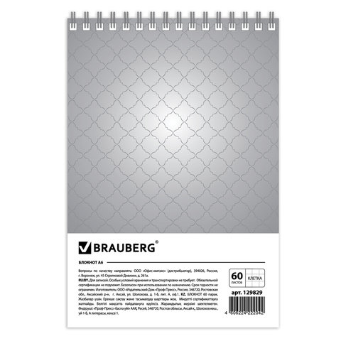 Блокнот МАЛЫЙ ФОРМАТ А6 97х145 мм, 60 л., гребень, картон, клетка, BRAUBERG, "Luxury", 129829