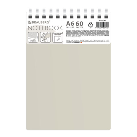 Блокнот МАЛЫЙ ФОРМАТ А6, 60 л., силиконовый гребень, обложка пластик, клетка, BRAUBERG, бежевый, 117563