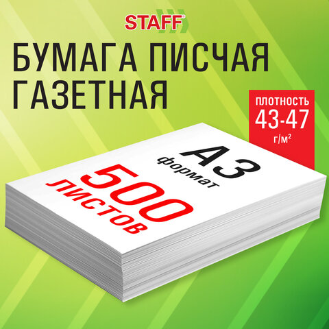Бумага газетная БОЛЬШОГО ФОРМАТА А3, 43-47 г/м2, 500 л, для офиса, дома и творчества, STAFF, 116646