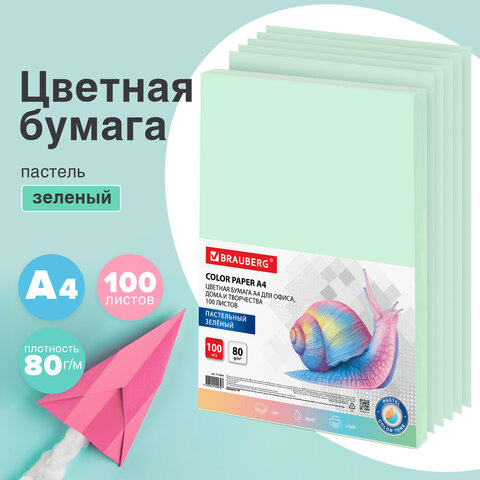 Бумага цветная BRAUBERG, А4, 80 г/м2, 100 л., пастель, зеленая, для офисной техники, 112444