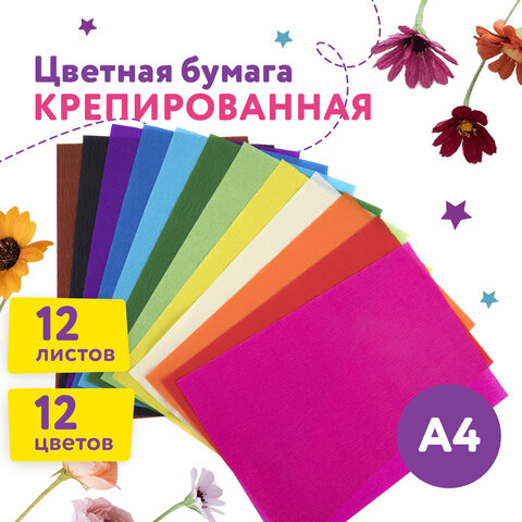 Набор бумаги с мелкоскладчатой (крепированной) поверхностью ЮНЛАНДИЯ используется для создания поделок и аппликаций, украшения открыток и других изделий, оформления подарочной упаковки. В наборе 12 листов формата А4 и 12 различных цветов.