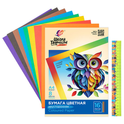 Цветная бумага А4 2-сторонняя офсетная, 16 л., 8 цветов, папка, ЛУЧ "Школа творчества", 210х297 мм, 30С 1791-08