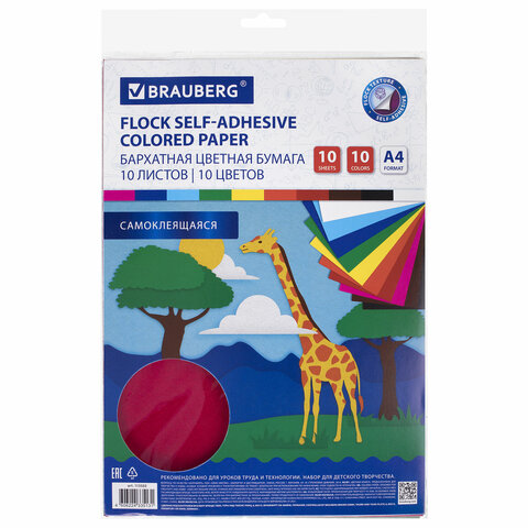Цветная бумага А4 БАРХАТНАЯ САМОКЛЕЯЩАЯСЯ, 10 листов 10 цветов, 110 г/м2, BRAUBERG, 113502