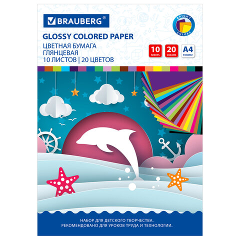 Цветная бумага А4 ДВУХЦВЕТНАЯ МЕЛОВАННАЯ, 10 листов, 20 цветов, в папке, BRAUBERG, 200х280 мм, "Дельфин", 129923