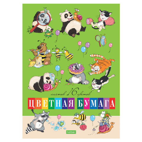 Цветная бумага А4 газетная, 16 листов, 16 цветов, на скобе, HATBER ECO, 200х270 мм, "Забавные животные", 060646, 16Бц4_18827