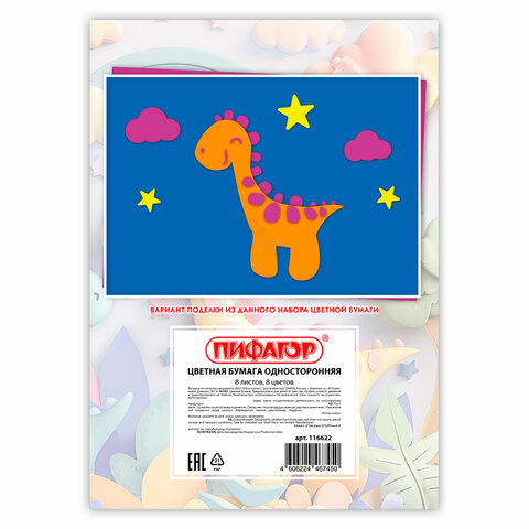 Цветная бумага ПИФАГОР, состоящая из ярких и насыщенных цветов, позволит создать прекрасную аппликацию или поделку. Цвета: чёрный, фиолетовый, синий, красный, зелёный, голубой, коричневый, жёлтый.