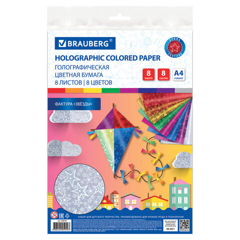 Цветная бумага А4 ГОЛОГРАФИЧЕСКАЯ, 8 листов 8 цветов, BRAUBERG, "ЗВЕЗДЫ", 124719