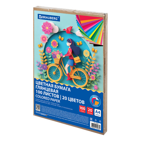 Цветная бумага А4 мелованная, 100 листов, 20 цветов, в коробе, BRAUBERG, 200х290 мм, "Прогулка", 116420